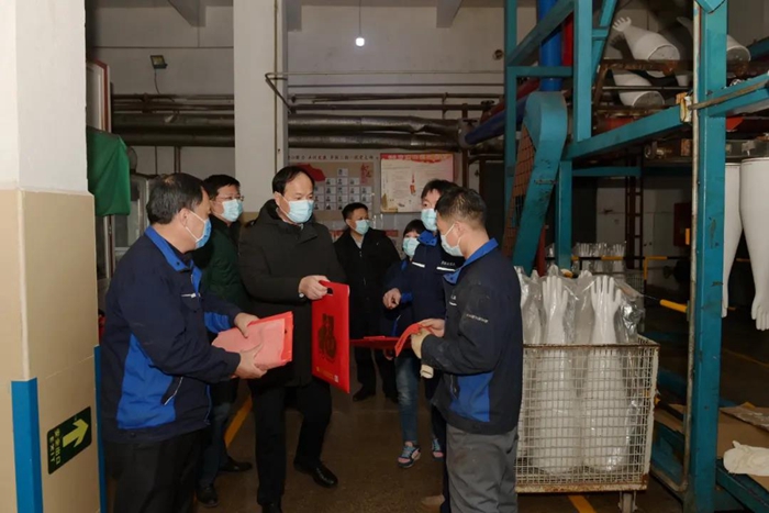 张时明一行考察了华腾橡塑公司生产现场,华腾美居酒店的“暖心驿站”,亲切慰问坚守在一线岗位的职工和困难职工代表,带去慰问品的同时也送上了亲切的问候和真情关怀。