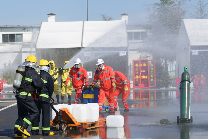 本次演练以华腾化工危险化学品储存库房储存的丙酮起火,引发了一系列的衍生事故,导致事故逐渐升级为背景,选取危险化学品仓库事故典型场景作为本次演练主要科目。